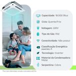Ele cuida da sua saúde, porque tem indicador que avisa quando o filtro precisa ser limpo. O split cassete conta com a função de mudança automática alternando os modos de aquecimento e refrigeração, com base na temperatura do ambiente. O ventilador turbo promove uma distribuição de ar uniforme. A tecnologia inverter garante economia mais eficiente, atinge a temperatura rapidamente, operação mais silenciosa e temperatura mais estável.